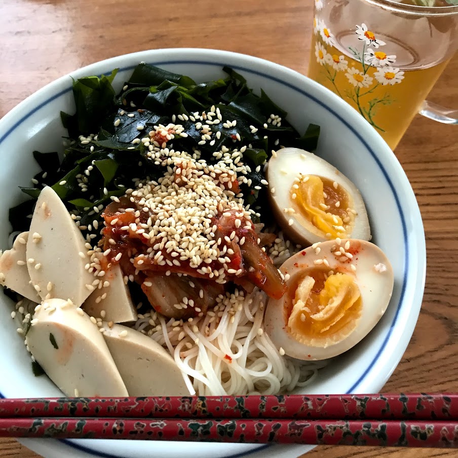 白だし、ごま、ゆで卵、わかめ、おさかなソーセージ、甘口白菜キムチ。