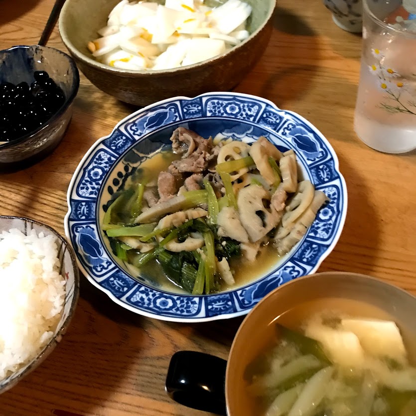 豚肉きり落としと小松菜、れんこんもいれて万能つゆで煮ました。