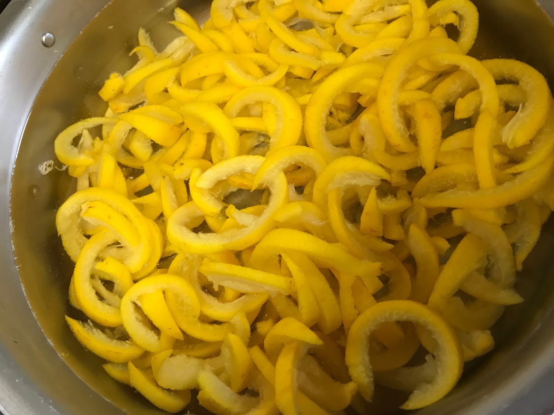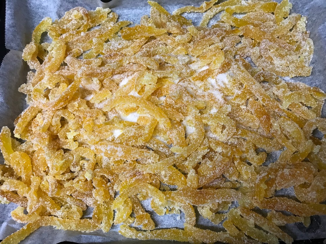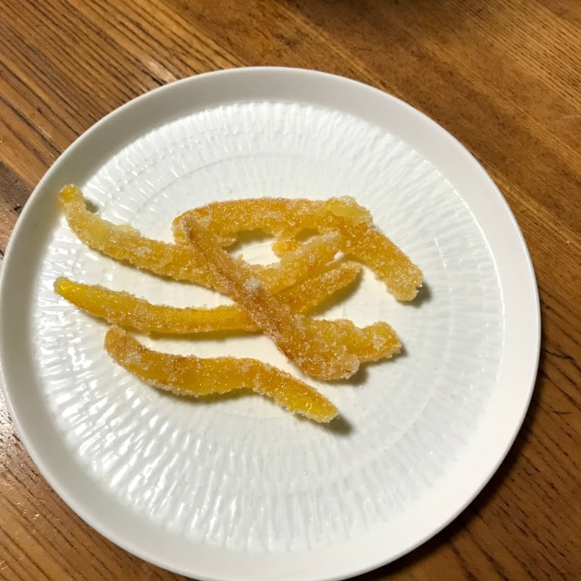 3回ゆでこぼして、水にさらして、 ビートグラニュー糖で煮て、