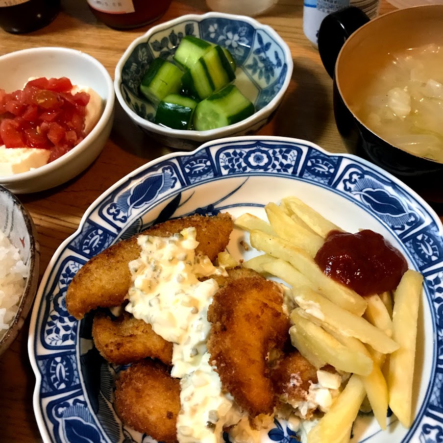 マヨネーズにゆで卵、玉ねぎ、刻みピクルスを入れたタルタルソースをかけました。 冷凍フライドポテトにケチャップ。 冷奴(刻みトマト、イタリアンエッセンス) きゅうり浅漬けの素で。 キャベツと玉ねぎの味噌汁。