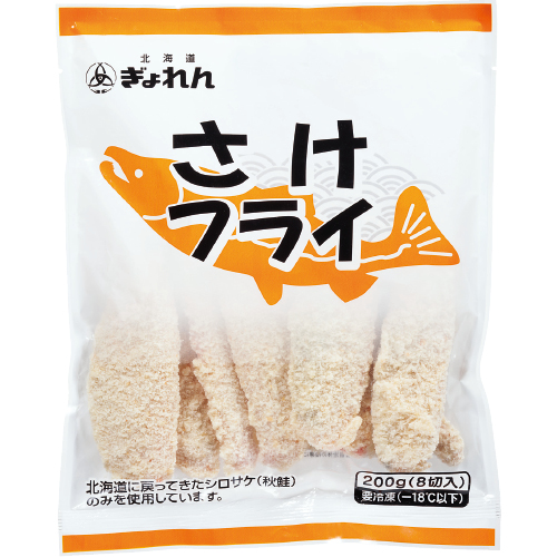 揚げるだけ、むき身えびフライとさけフライ。 北海道ぎょれん・さけフライは200gで8枚だから、 一口サイズでお弁当向き。 今度は一枚満足のほうを注文します。