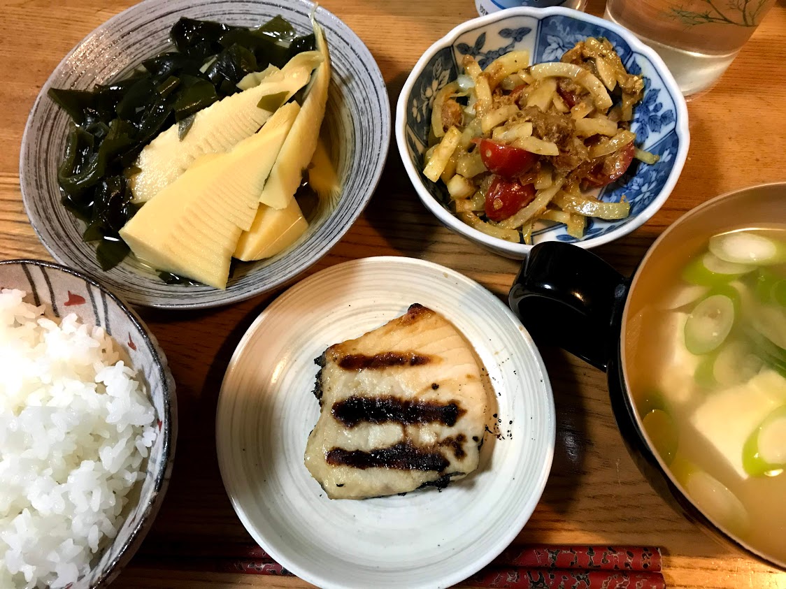夜は、めかじき西京漬け、わかたけ煮、