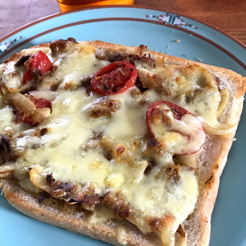 さば味噌煮缶のサラダは、少し残ったので翌日パンにチーズものせて焼きました。