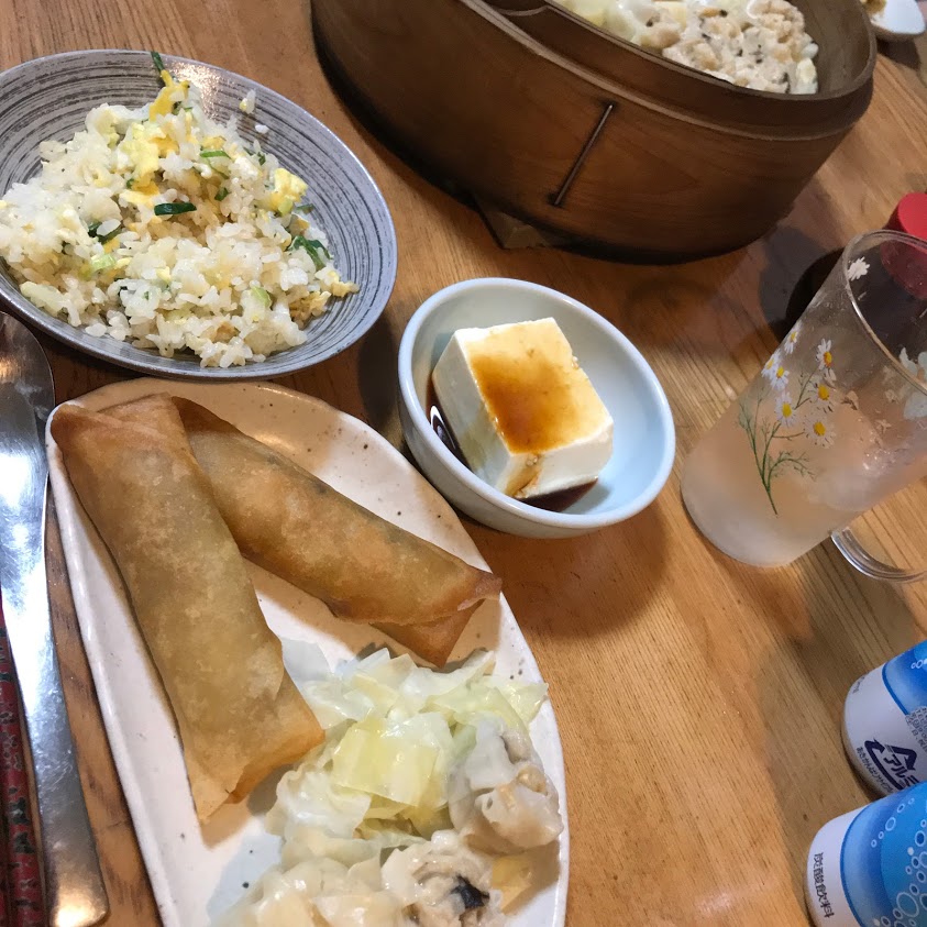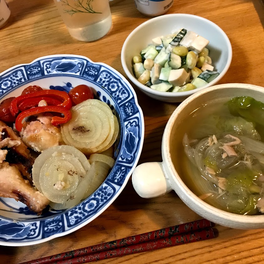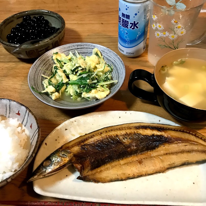 水菜の卵炒め、豆腐の味噌汁、黒豆。