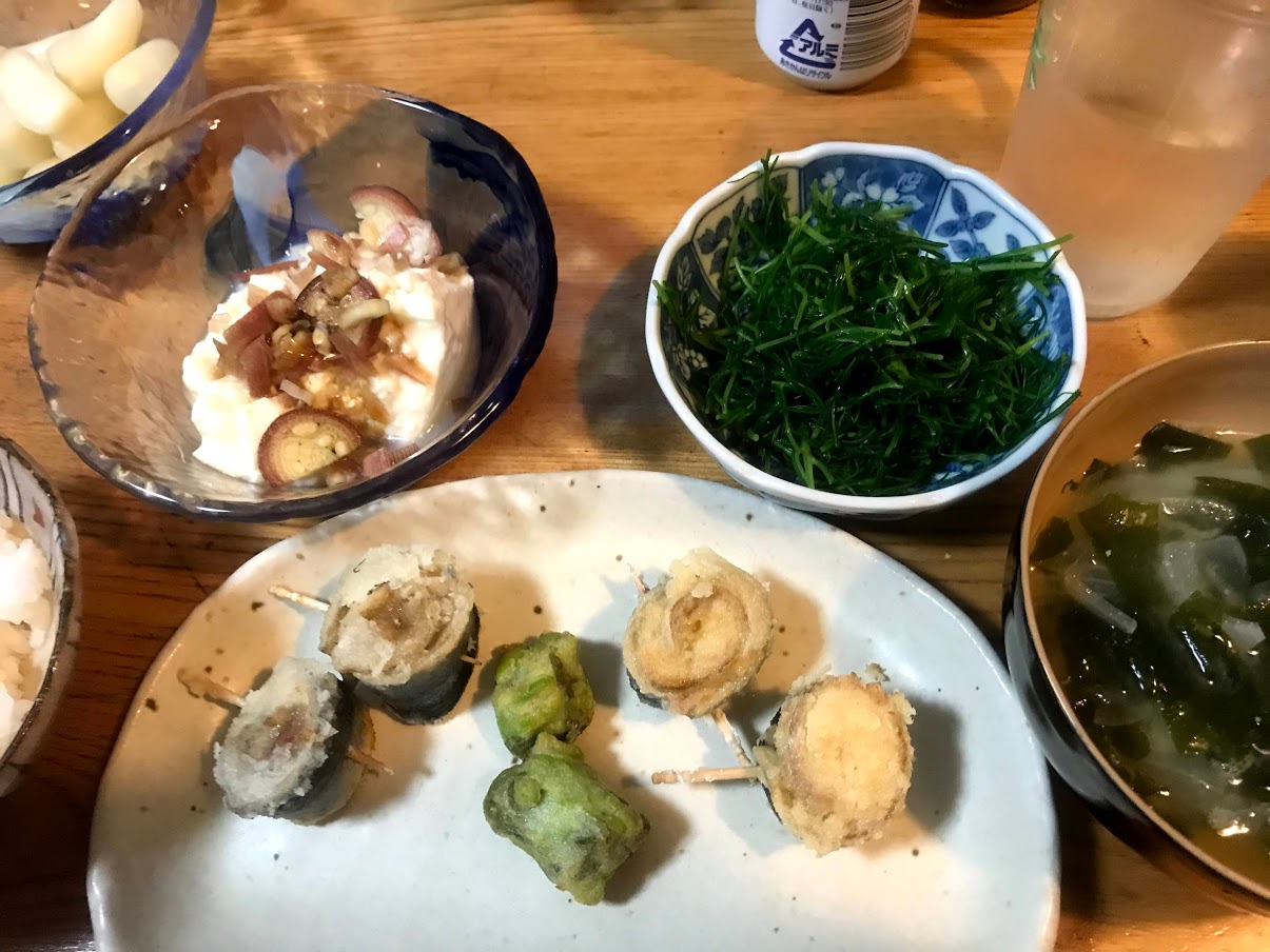 寄せ豆腐みょうが。おかひじきポン酢。玉ねぎとわかめの味噌汁。