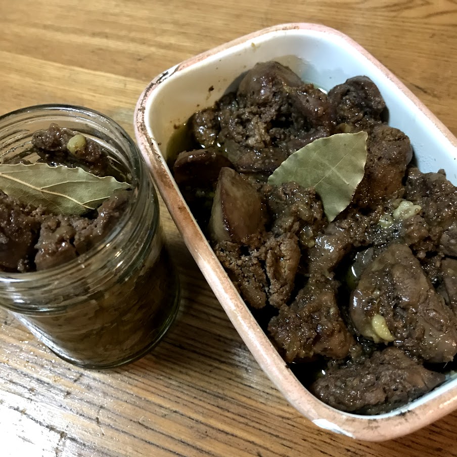 鶏肉きもでレバーのオイル漬け。
