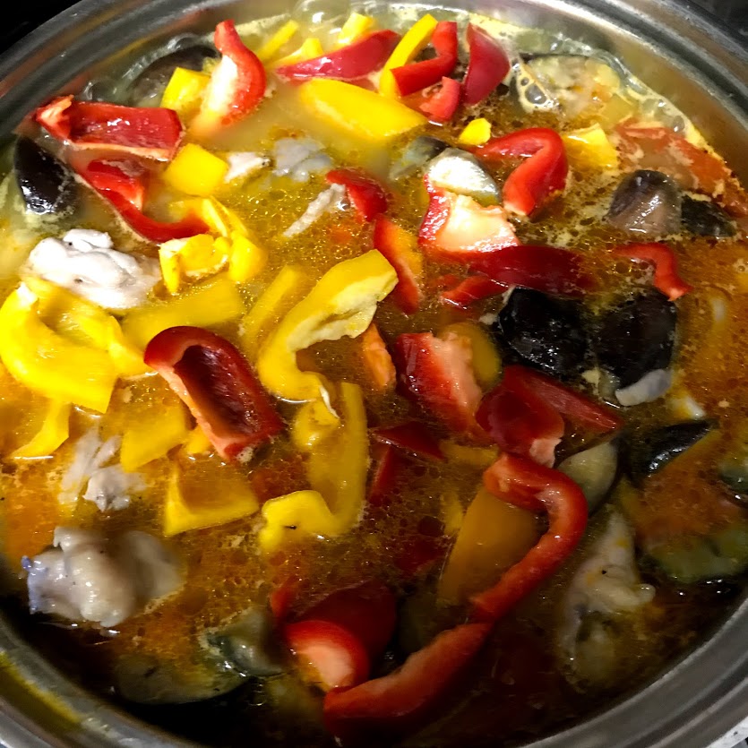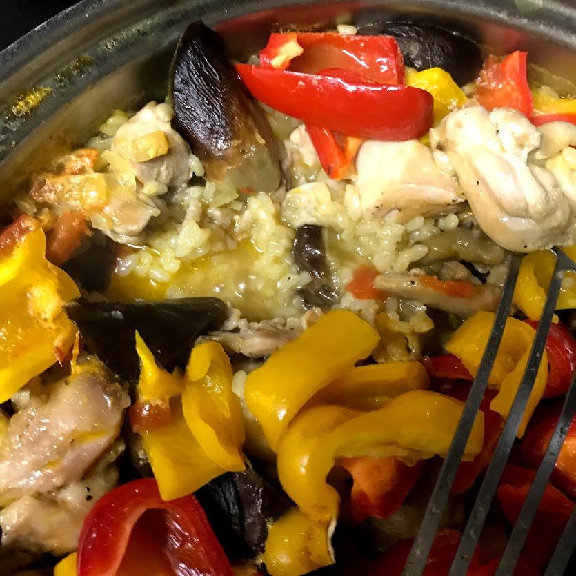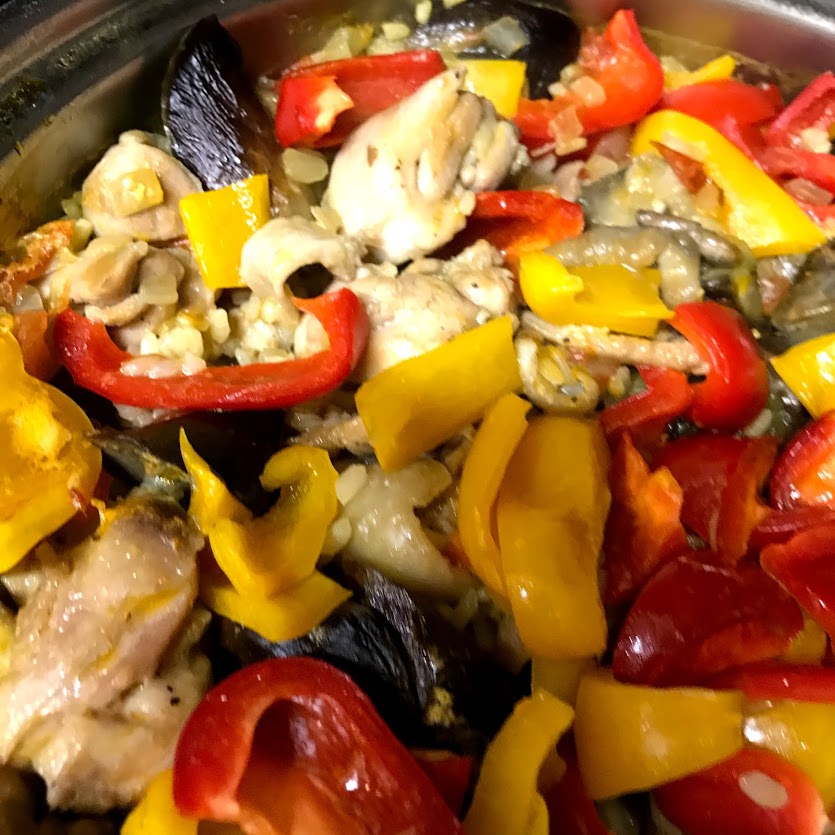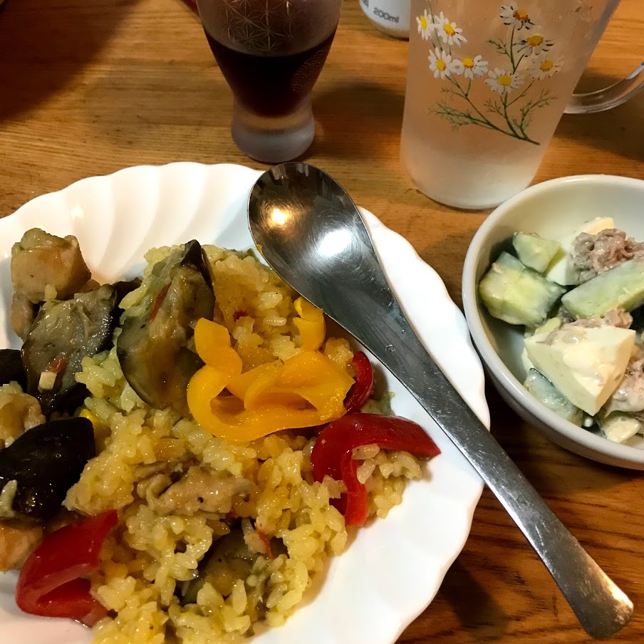 うちは魚介類より鶏肉、そしてたっぷりのなすとパプリカ。