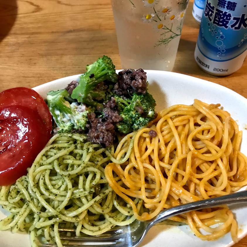 冷凍えびのトマトクリームソースとジェノベーゼソースをからめただけ。