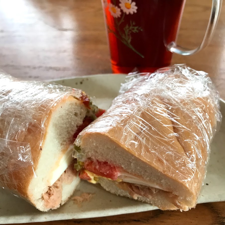 ドッグロールに、まぐろ油漬け缶、ゆで卵、トマト、