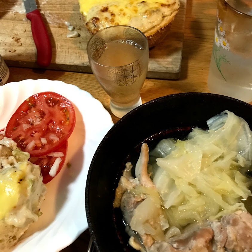 鶏肉は後の1枚も半分に切って、3枚をキャベツとスープに。