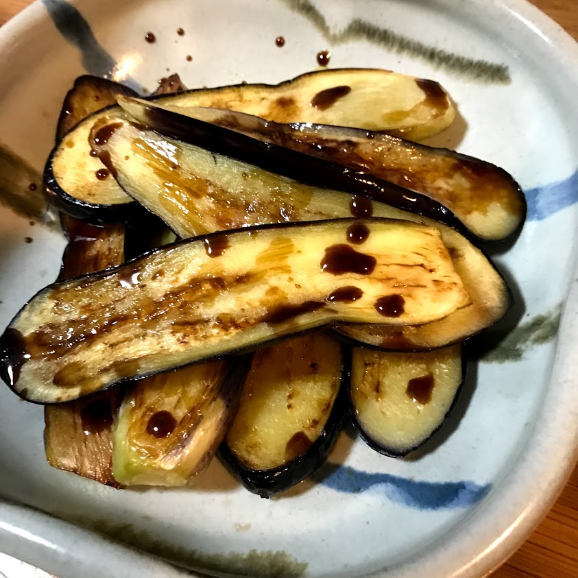たてに3〜4枚に切ったなすをオリーブオイルで焼く。