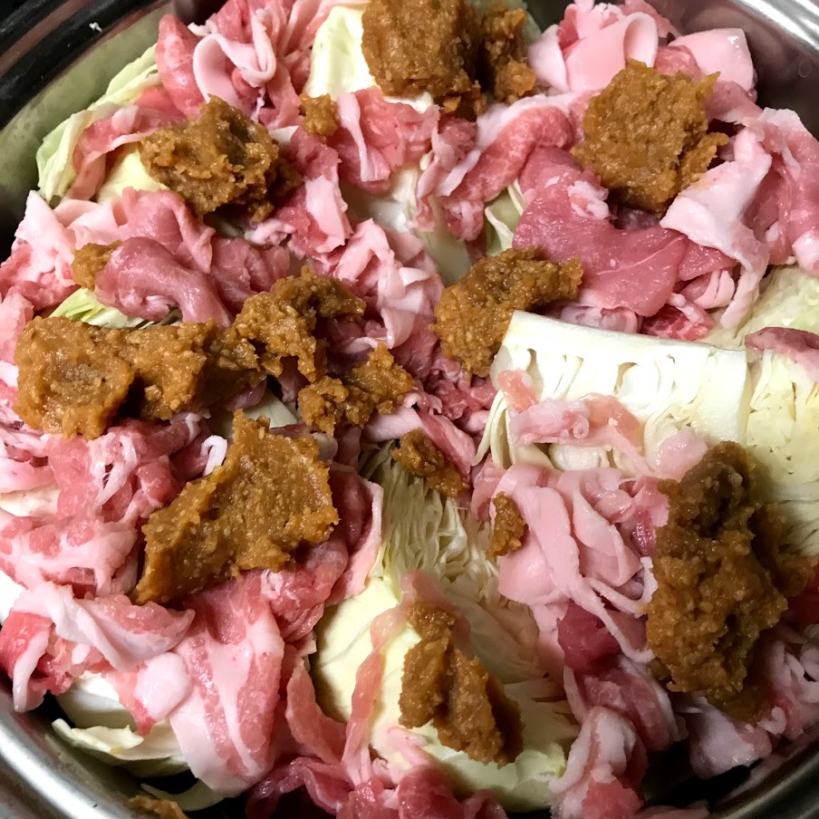 にんにくと大きく切ったキャベツと豚肉の上に味噌を乗せて煮るだけなので簡単です。