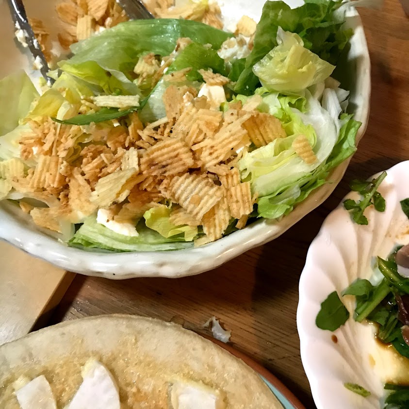 レタス1個、ポテトチップス1袋、豆腐1丁のサラダに