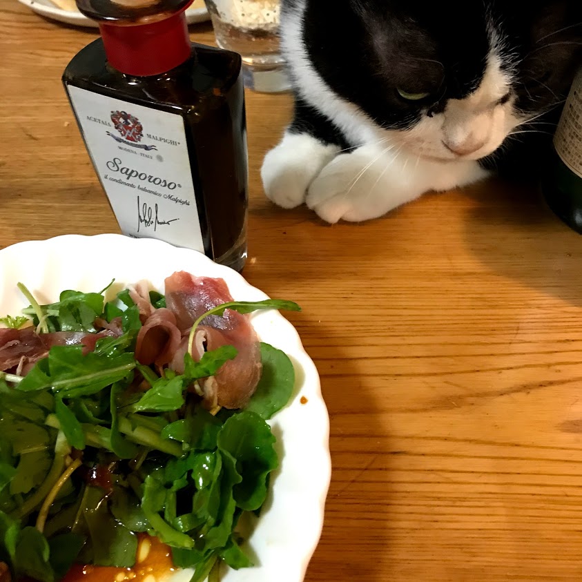 ルッコラと生ハムのサラダにオリーブオイルとバルサミコ。