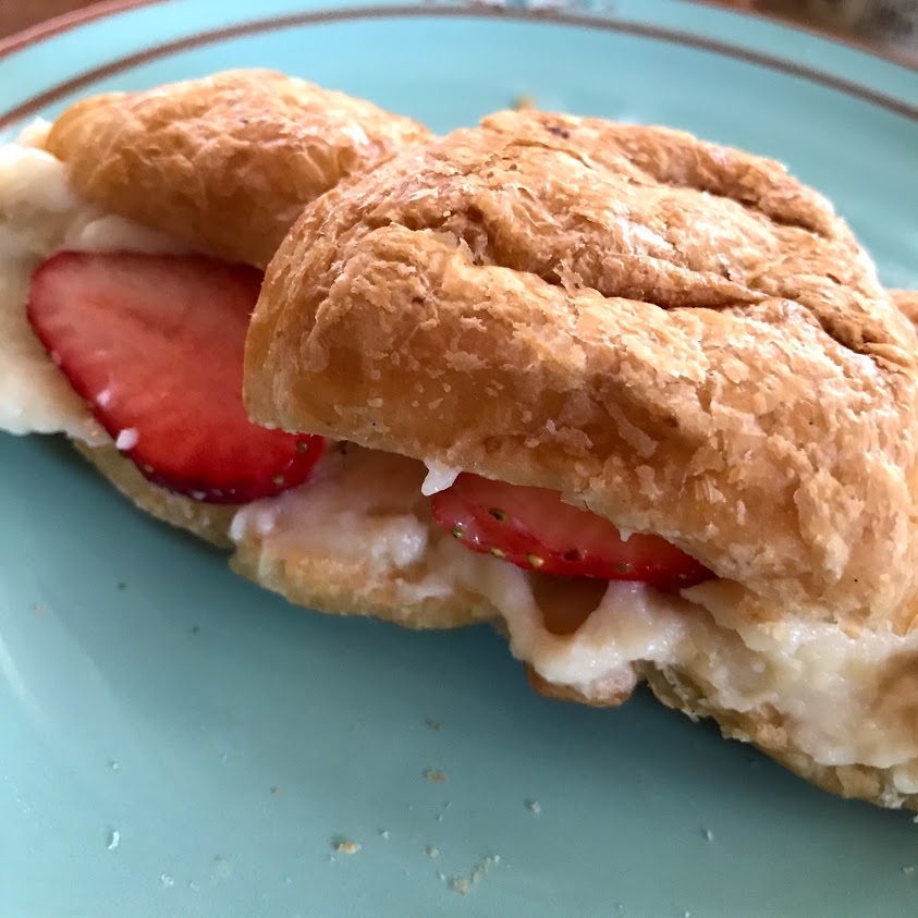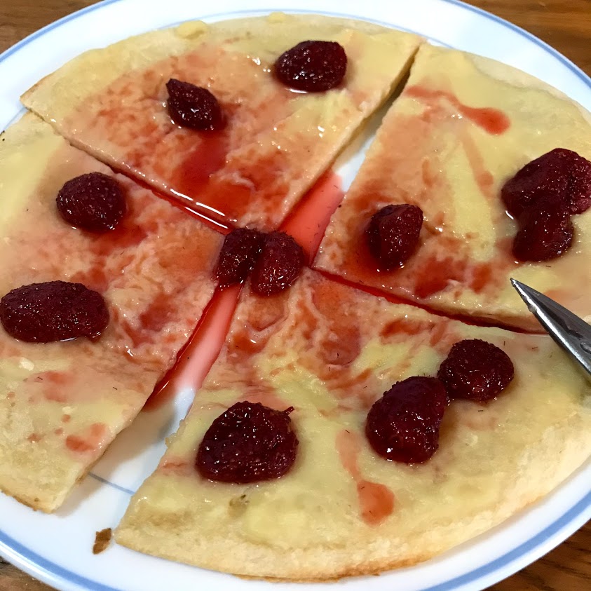 ピザクラストにカスタードを塗って焼いて、イチゴジャムのおやつ。