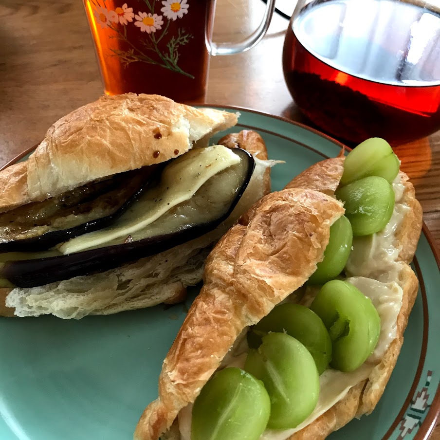 エッグじゃなくて、ブロックベーコンと焼いたなすをはさみました。