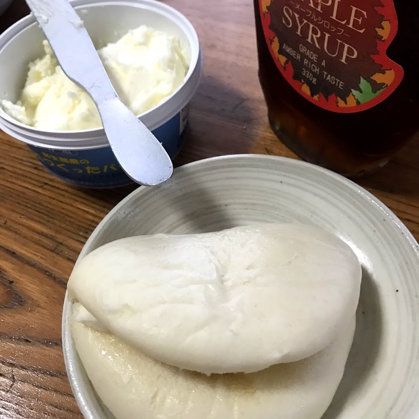 新生酪農のバターとプレス・オールターナティブのメープルシロップで。