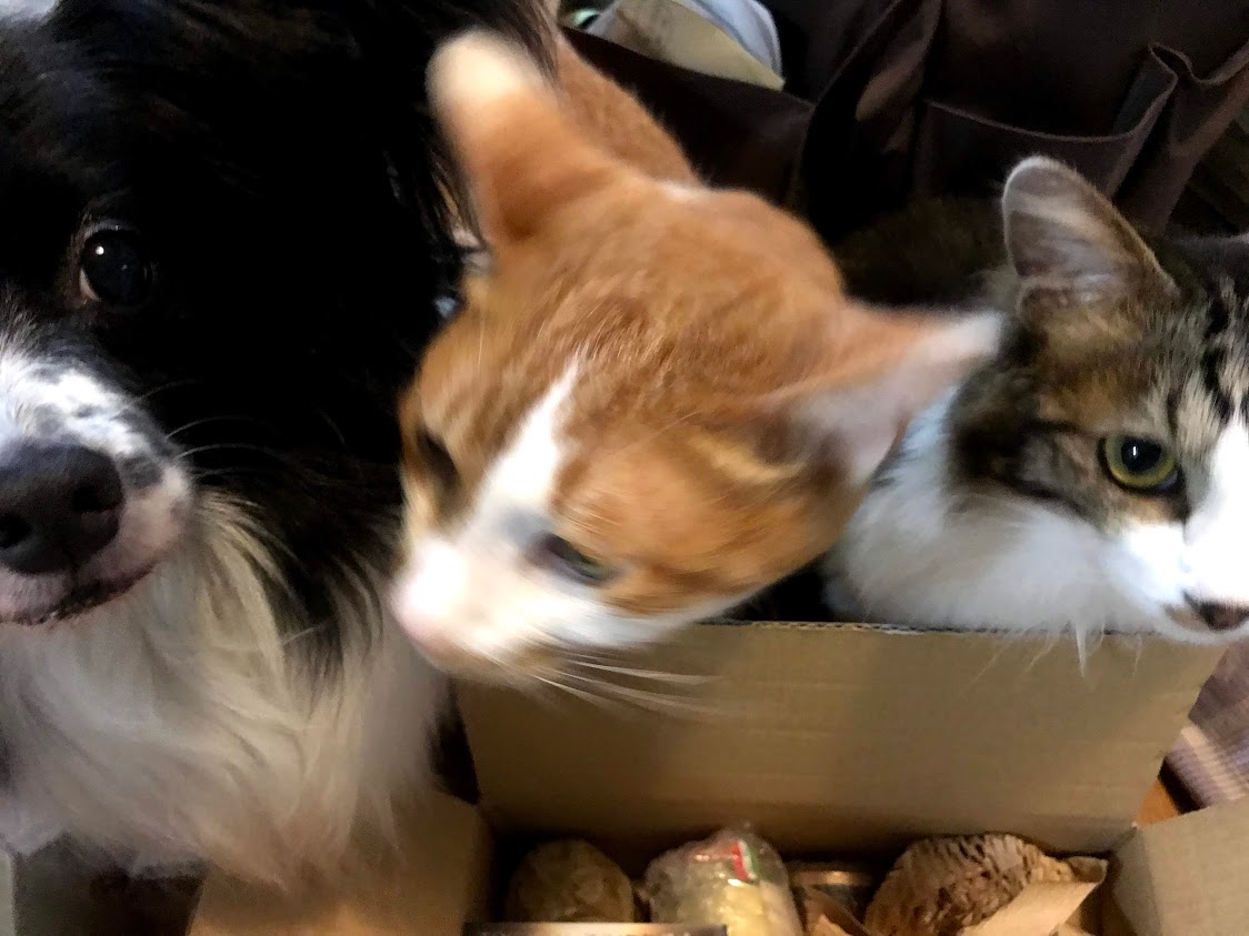 箱を開けたら、中が見たくて群がるやじうまな猫たちと犬…