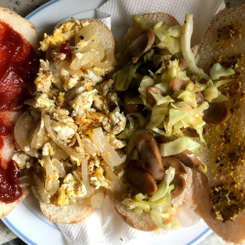 ドッグロールに新玉ねぎ卵炒め・ケチャップ、