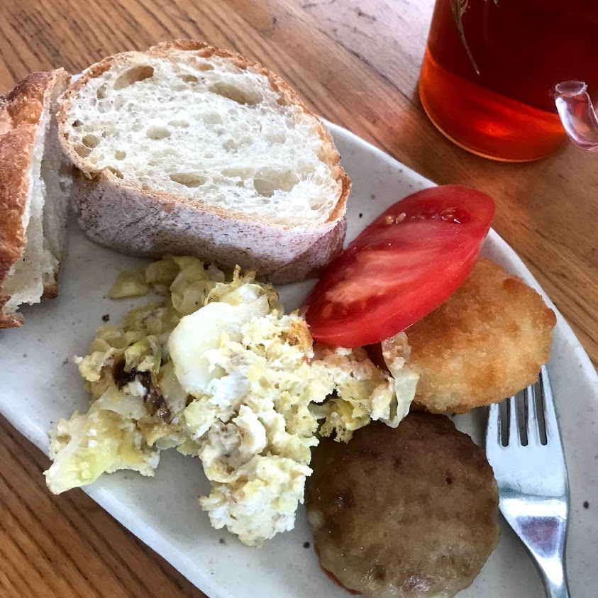 春キャベツ卵炒め、トマトとスライスチーズ。