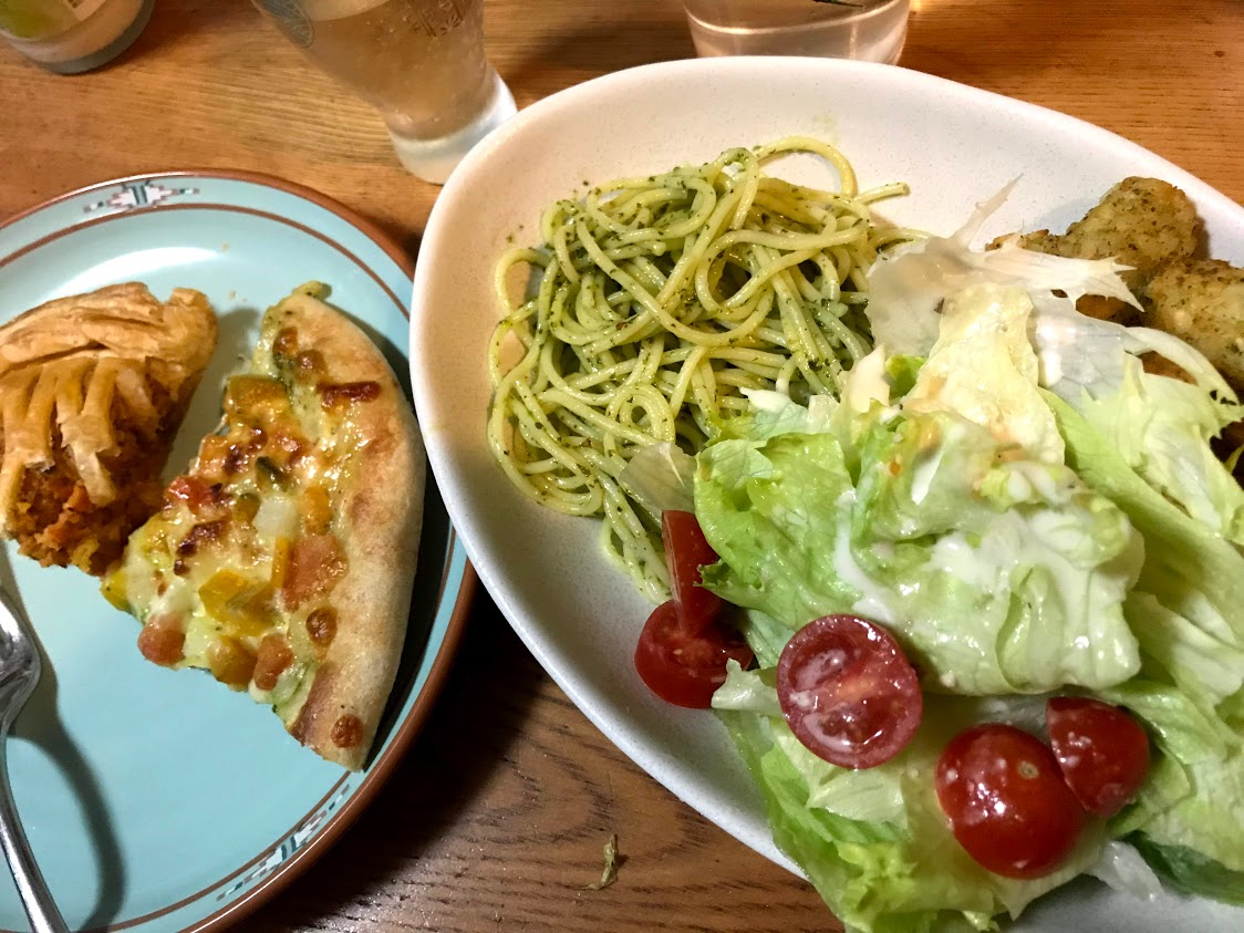 ミートパイと、モッツアレラとバジルの菜園風ピザ。