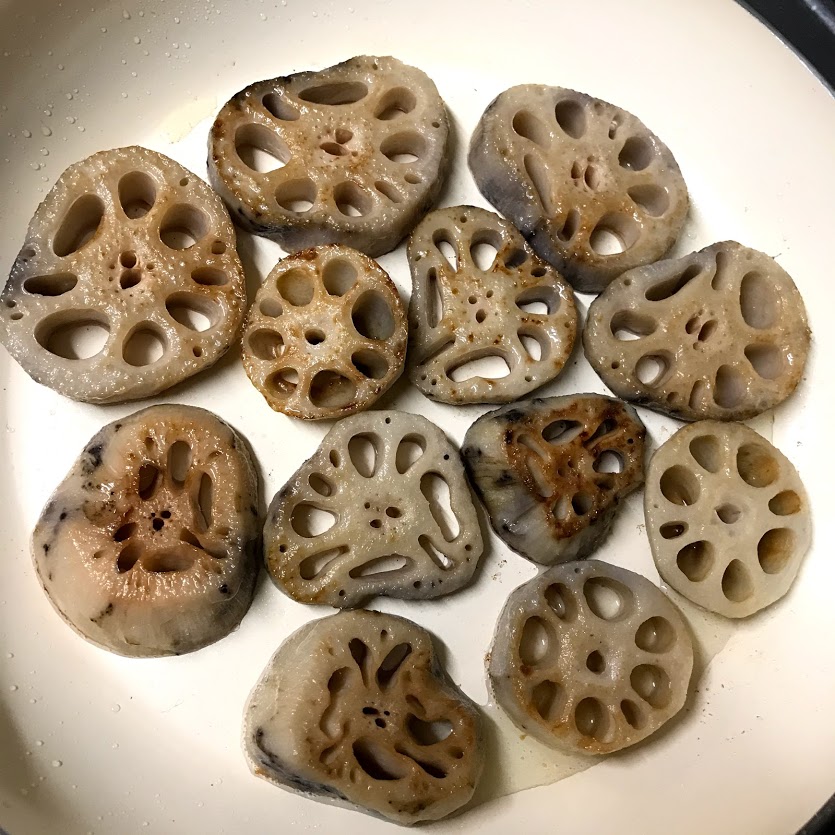 れんこんステーキは厚切りにしてなたね油でじっくり焼くだけ。