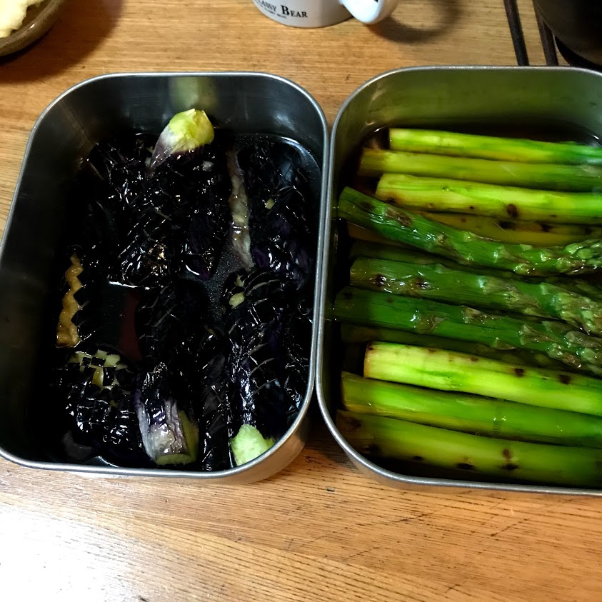 アスパラガスはグリルで焼いて白だしにつけたもの。