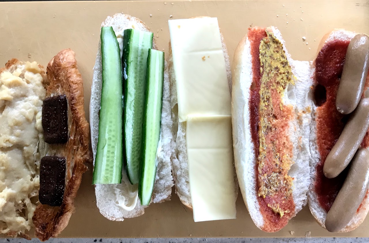 ドッグロールに、ポークウインナ、ケチャップ、粒入りマスタード。