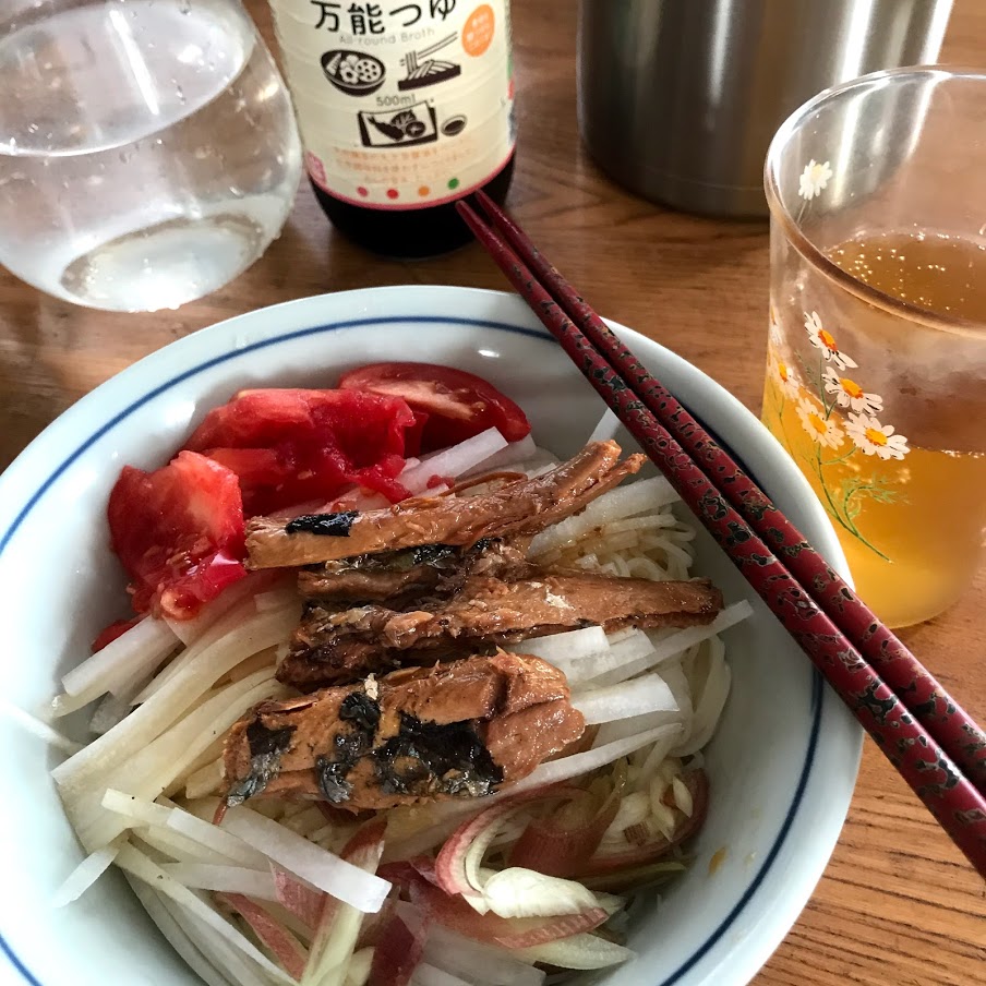 ぶっかけそうめん。トマト、大根、みょうが、さんま蒲焼缶、万能つゆ。