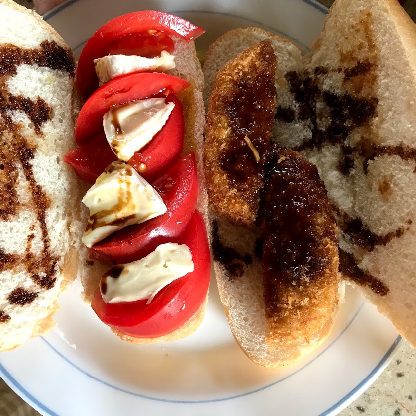 トマトと切れてるカマンベールチーズ。かかってるのはソースじゃなくてバルサミコ・サポローゾ。