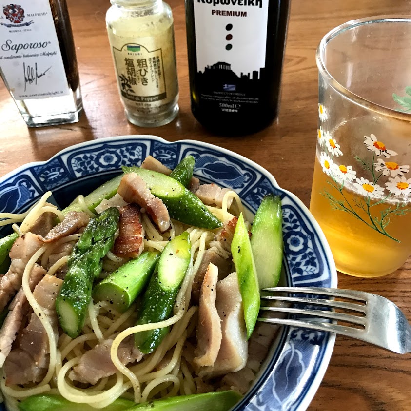 スパゲティ、ベーコンアスパラガス、炒めるときベーコンの脂だけなので、好みでオリーブオイルとバルサミコをかけて。おやつにクロワッサンにカスタードクリームをはさんだの。