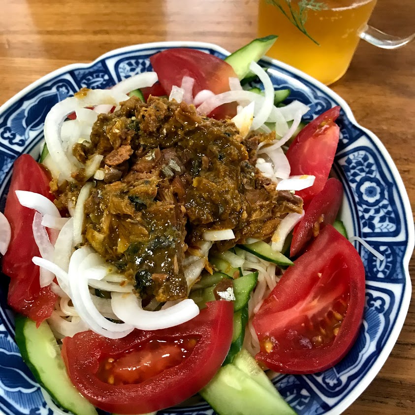 火曜日は在宅勤務でそうめん、さば味噌カレー味。