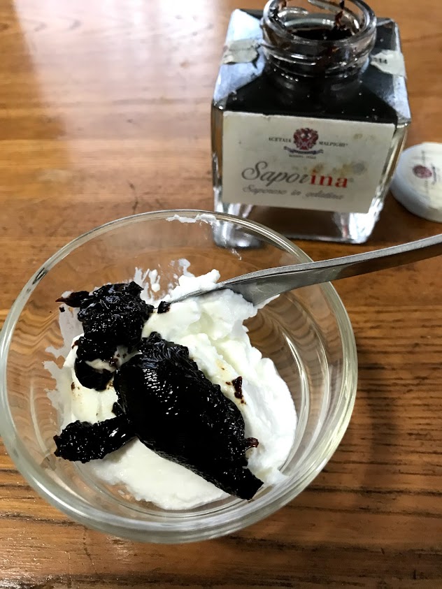 3時のおやつは水切りヨーグルトにサポリーナ(バルサミコのスプレッド)