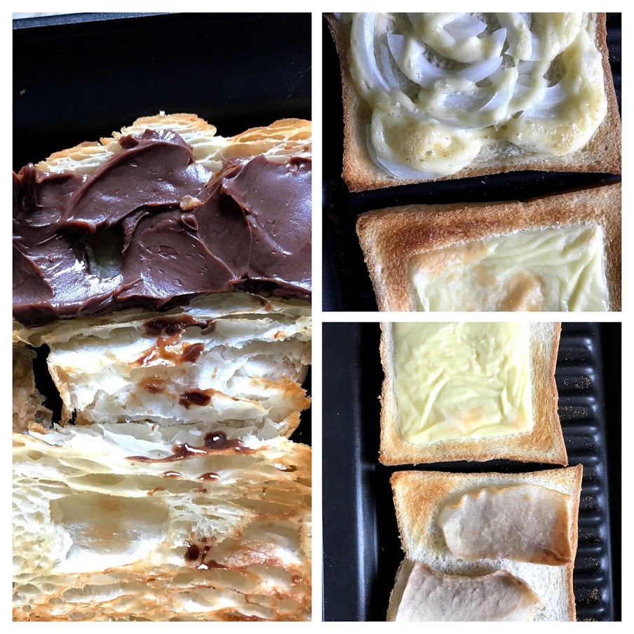 スライスチーズとモモハム、スライスチーズと玉ねぎマヨを乗せて焼いたのを