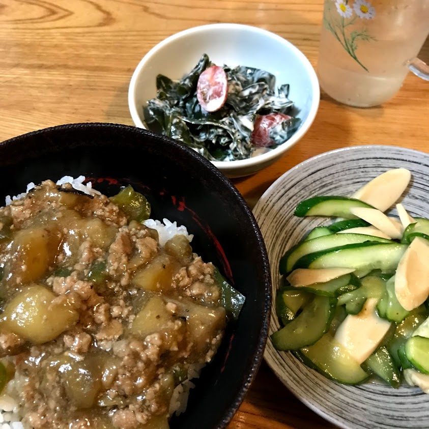 麻婆なす丼、わかめとトマトマヨネーズ。
