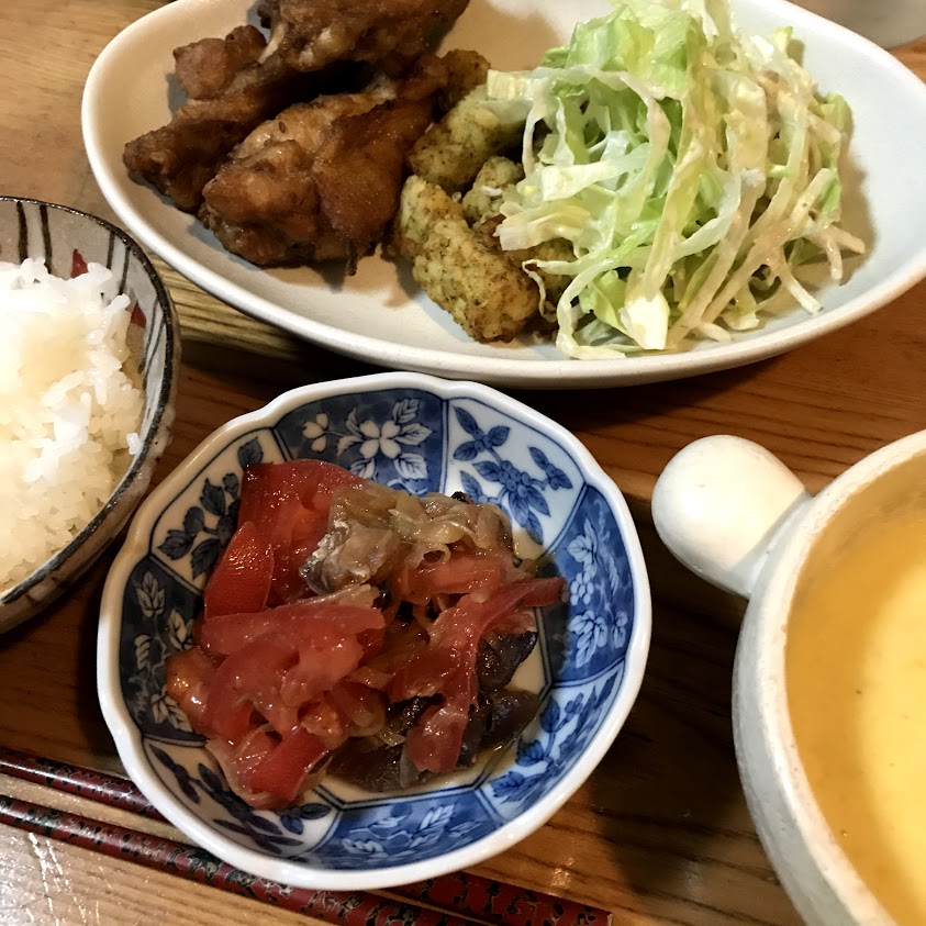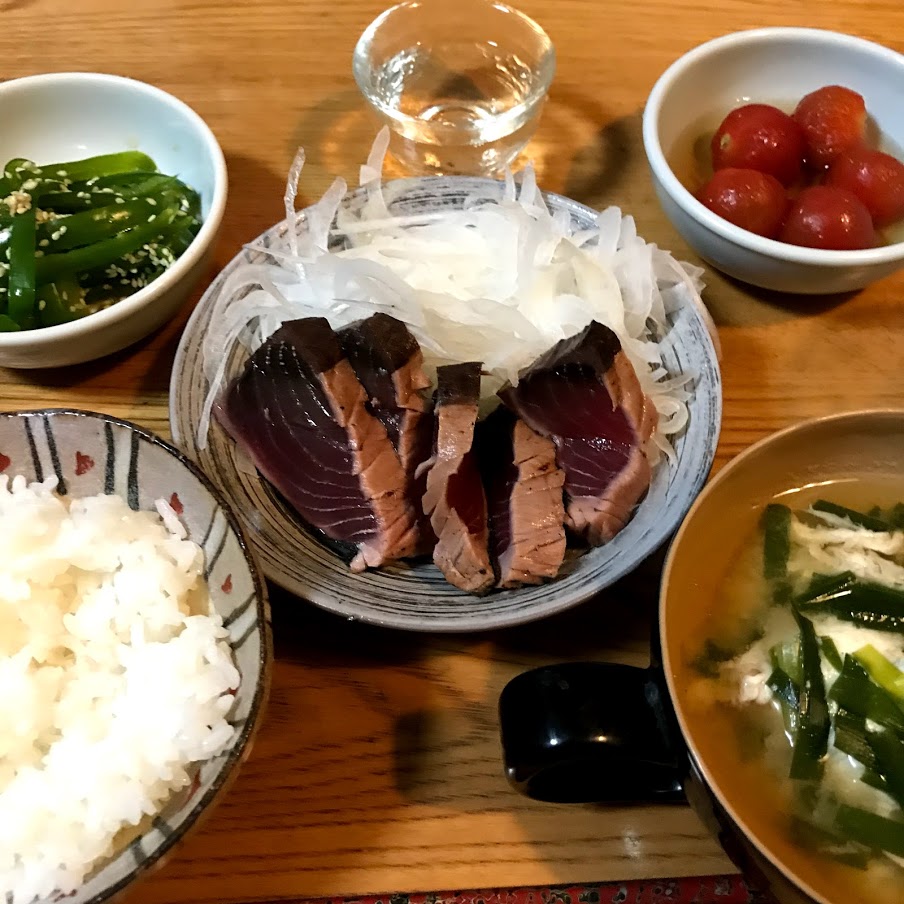 残り1つのかつおたたきと玉ねぎ、トマトの和えたの、ポン酢+ごま油。