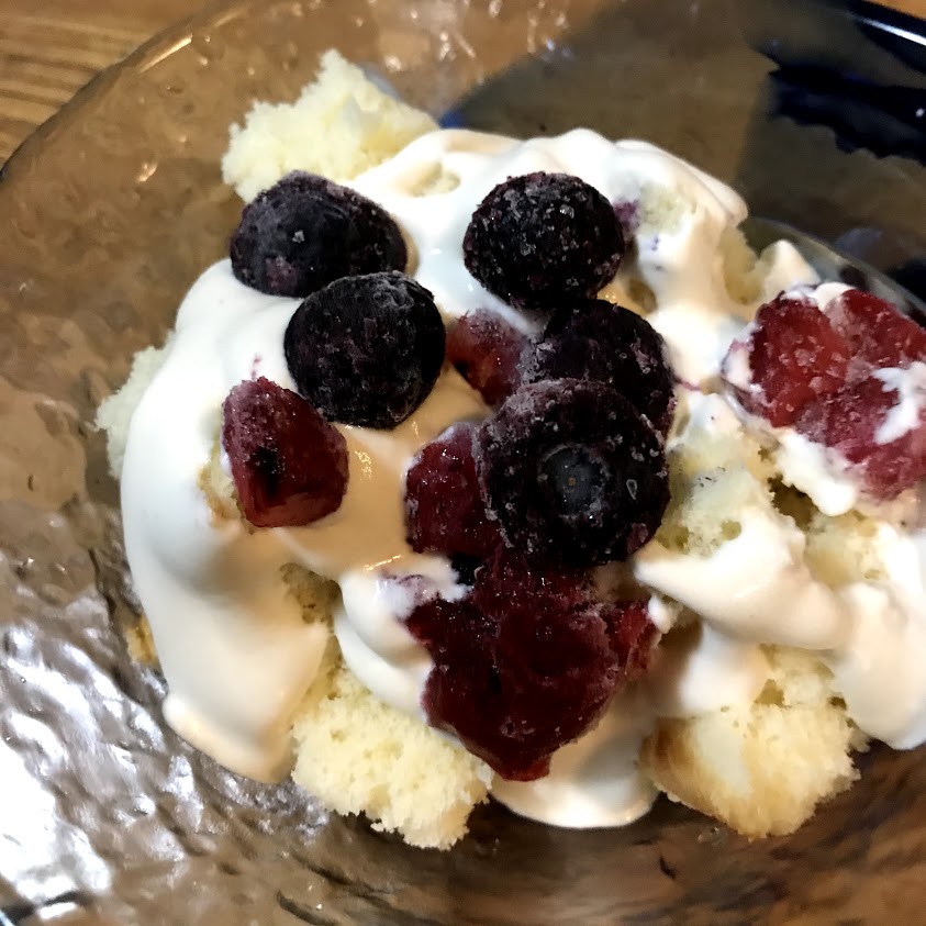 ケーキ台をくだいて泡立て生クリームをかけて、