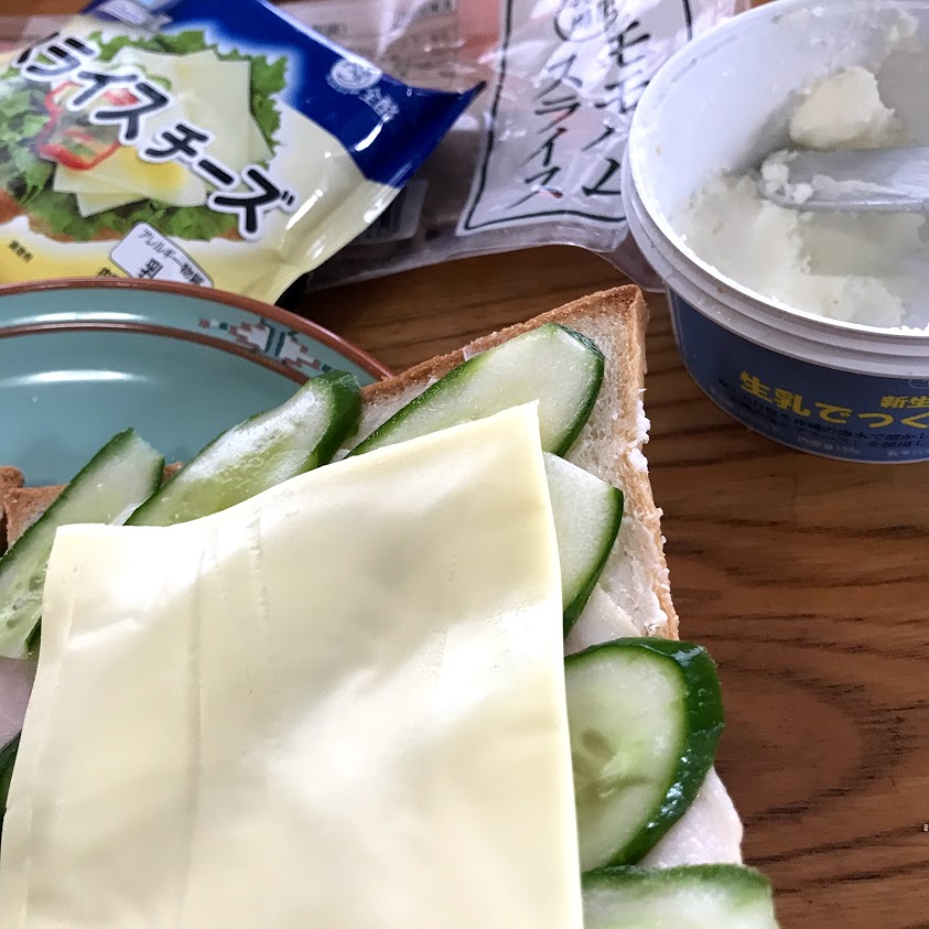 平牧モモハムスライス、きゅうり、スライスチーズ、新生酪農バターでサンドイッチ。