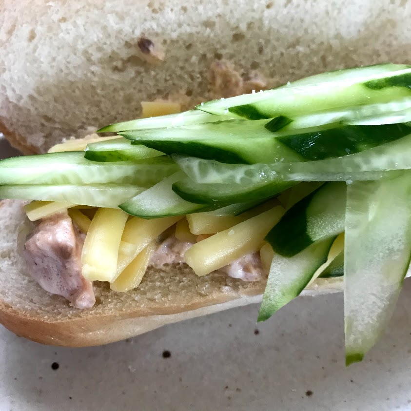 ドッグロールにさけ水煮缶、マヨネーズ、きゅうり。