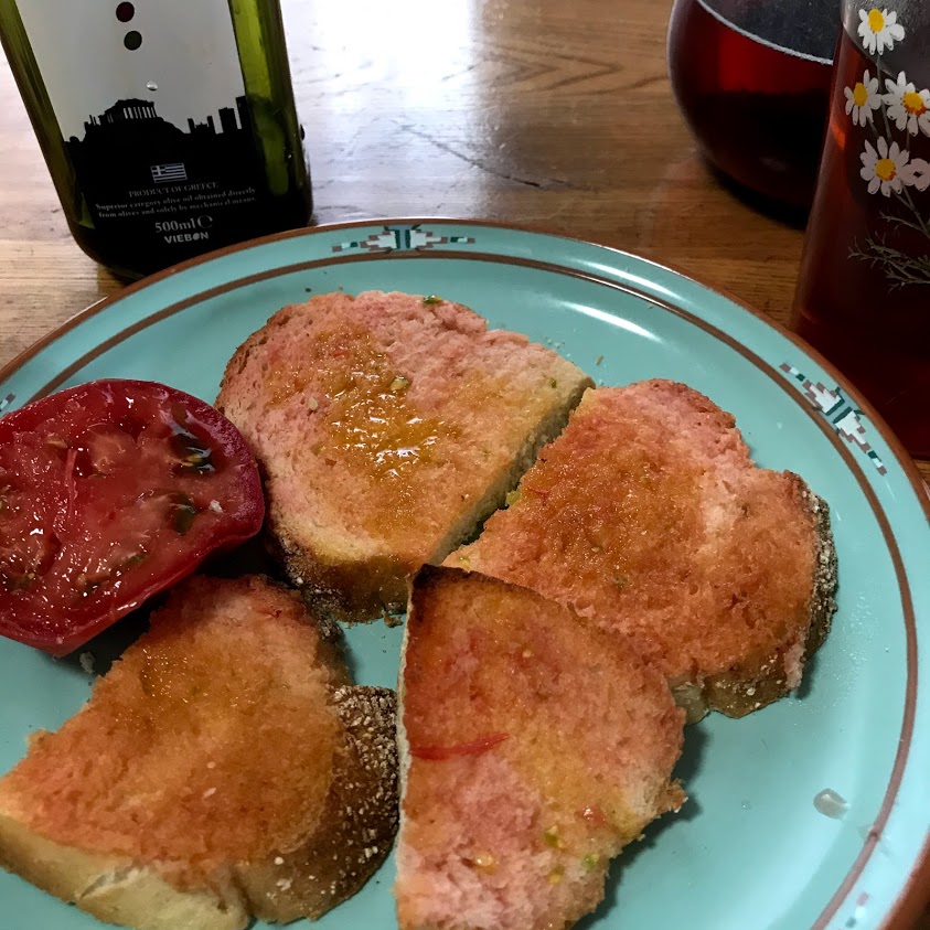カンパーニュ、カリカリにトーストしてトマトをこすりつけてオリーブオイルをたらり。