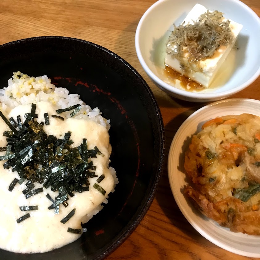 冷凍のかき揚げと、ひややっこにじゃこ炒め。