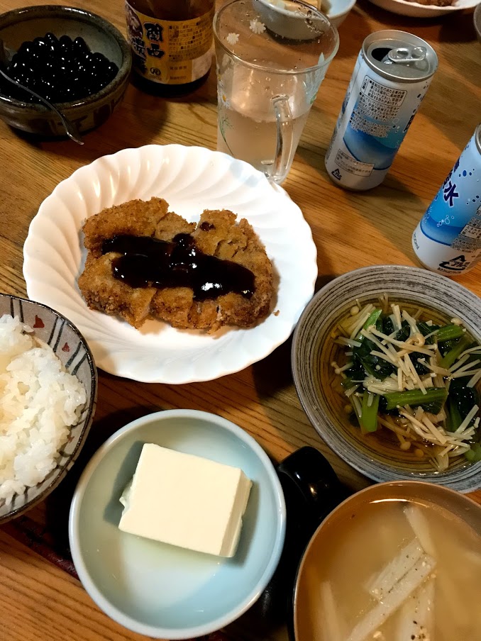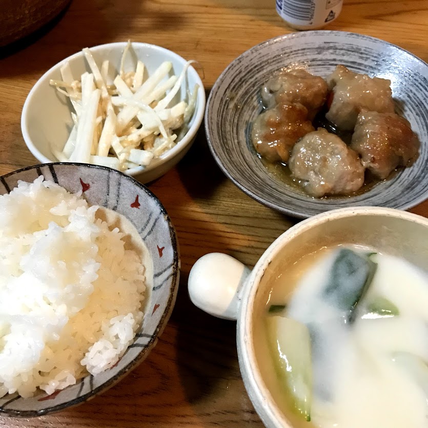 小松菜とえのきだけの煮浸し、冷奴、大根の味噌汁。