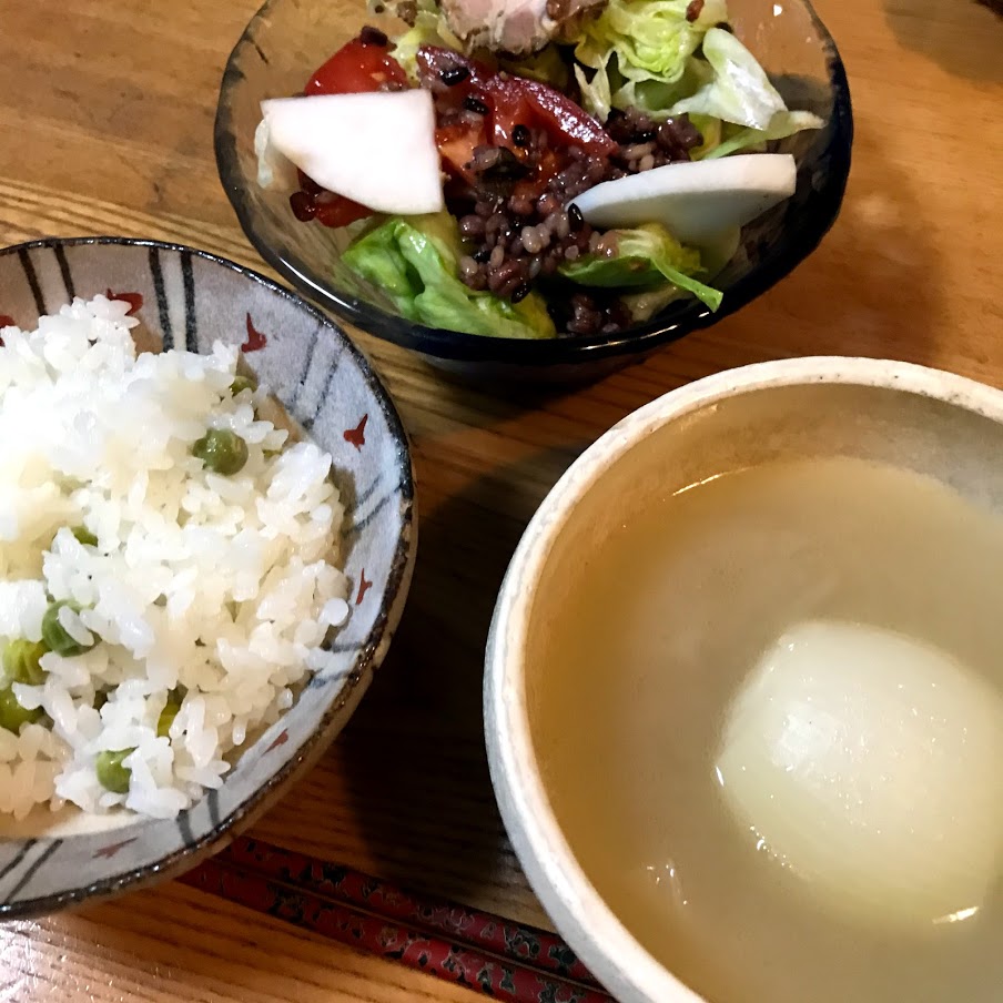 紅茶豚たくさんのサラダ、レタス、トマト、かぶ、雑穀米。