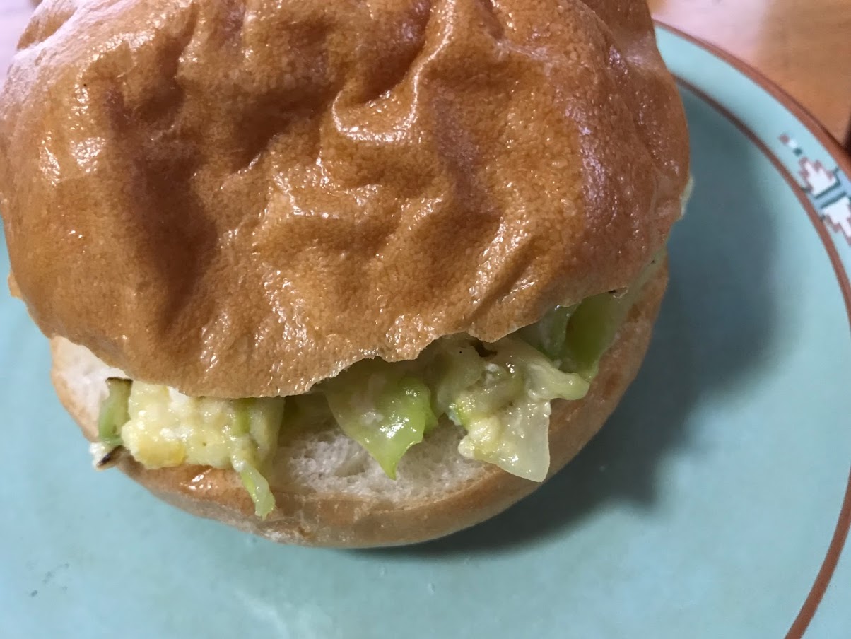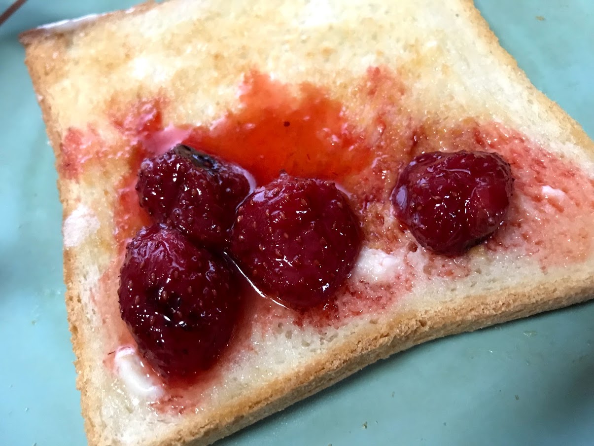 キャベツ、チーズ、卵炒め&イチゴひジャムのせトースト。