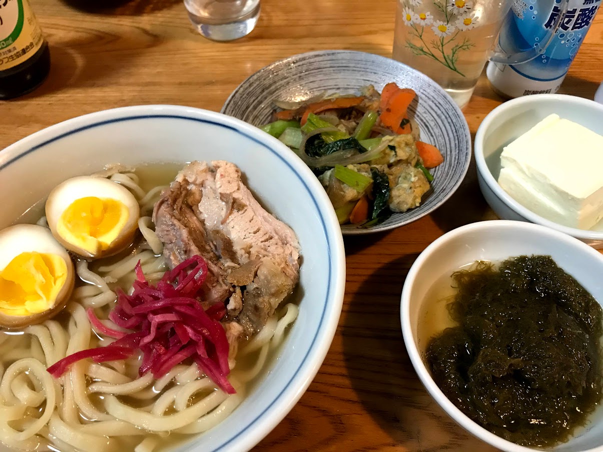 web限定沖縄そば、醤油漬け卵、豚角煮、紅しょうが。