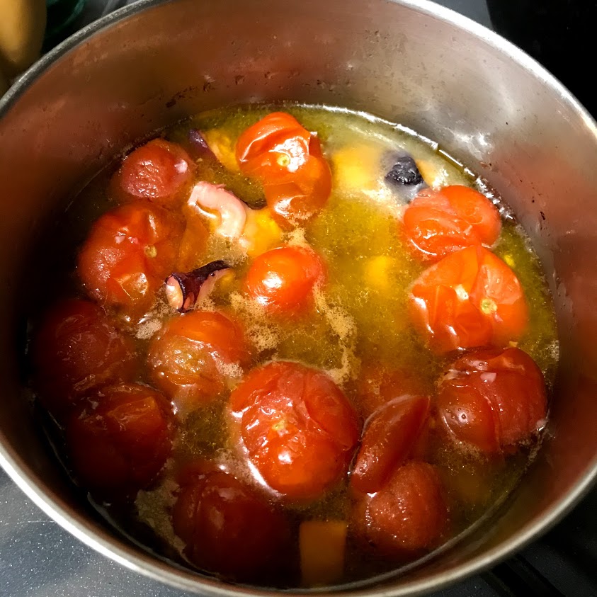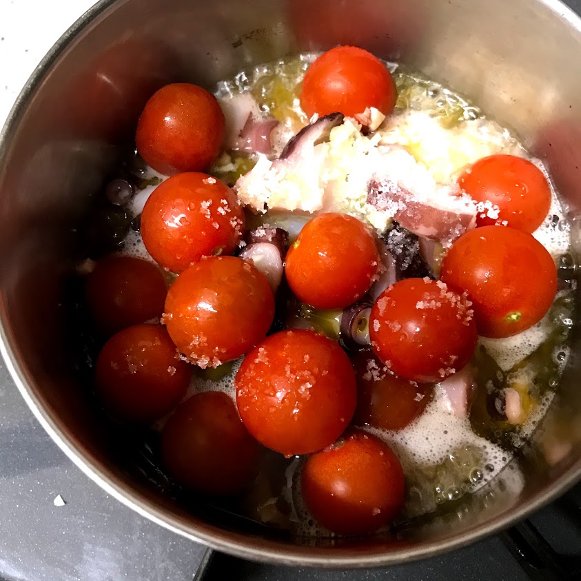 アヒージョ風に、たこ、ミニトマト、にんにくみじん切り、真塩を
