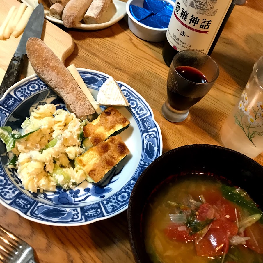 デポーで値引きだったライ麦入りの細いフランスパンはトーストして、スープに浸して食べました。