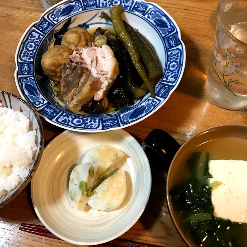 煮汁にオクラ、なす、おからっこがんも( 埼玉独自品)を保温鍋に入れて置いたの。