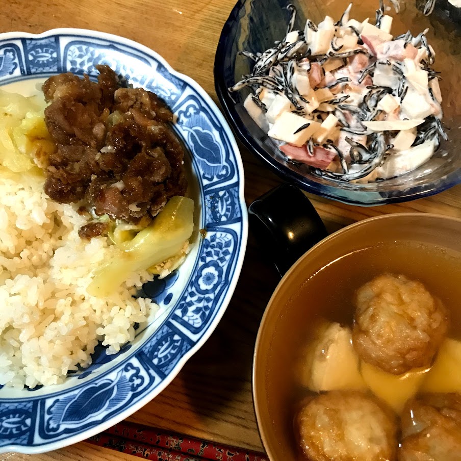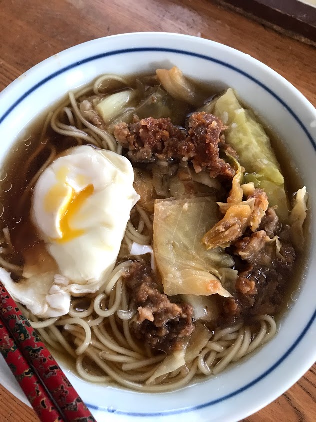 落とし卵と、夜ご飯の残りのキャベツと豚肉の蒸したのを乗せて。