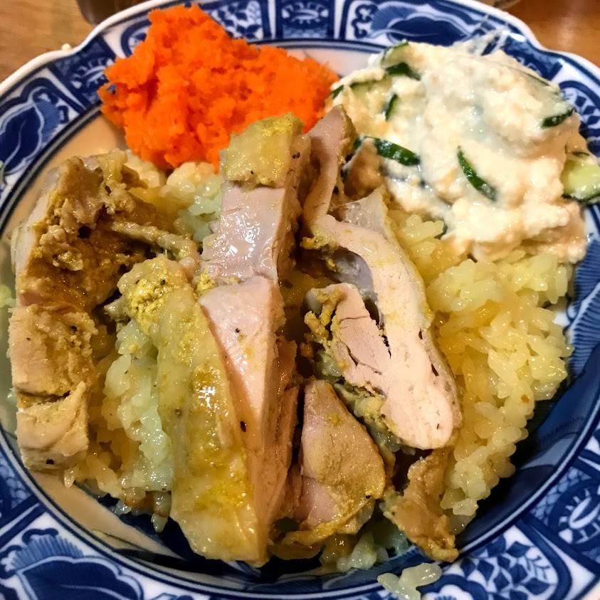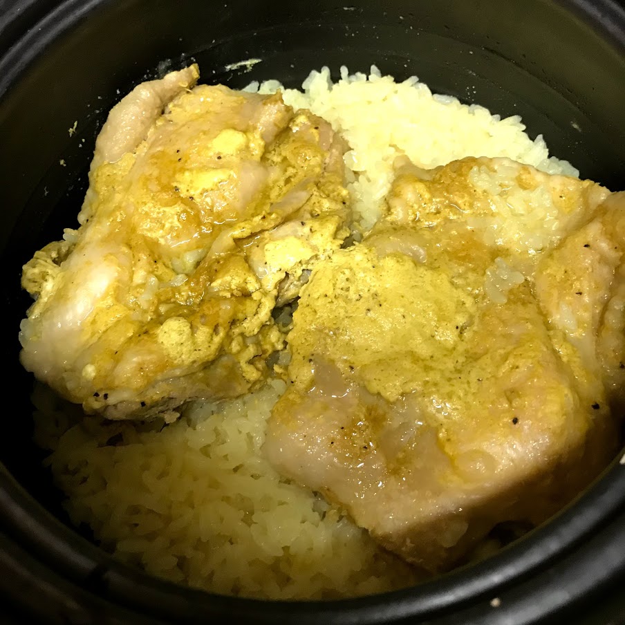 鶏肉はヨーグルトごとお米に乗せて炊きました。